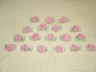 Estas rosinhas feitas em fita de seda resultam muito bem quando aplicadas nos trabalhos. São fáceis de fazer, mas é preciso apanhar o "jeito". Há imensos videos na net a explicar como se faz, basta fazer uma pesquisa com "rosas de fita". Quem não quiser ter esse trabalho, pode comprá-las já feitas numa retrosaria, custam 15 cêntimos cada uma, e há várias cores. Confesso que a primeira tentação foi mesmo essa, mas já não havia rosinhas cor-de-rosa, então fui "obrigada" a aprender a fazê-las, e ainda bem, porque com tecidos de várias texturas e tamanhos, obtêm-se resultados muito engraçados e diferentes.